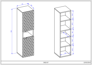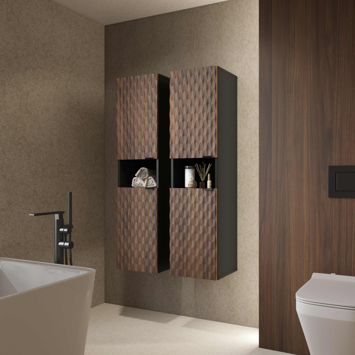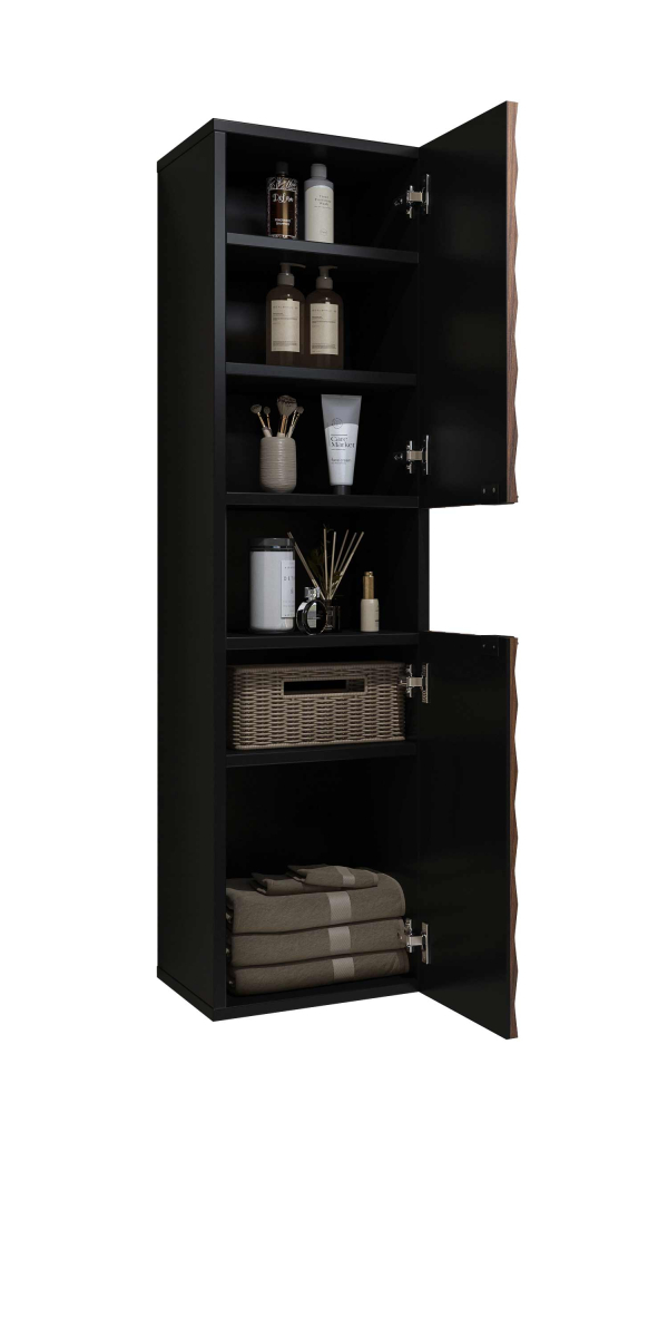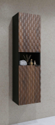 Moderný kúpeľný nábytok ENZO - vysoká skrinka na zavesenie 30WTNN07 Ľ,P. Kvalitný sektorový nábytok do kúpeľne s 3D vzorom na dvierkach. Korpusy o hrúbke 18 mm, sú vyrobené z laminovanej certifikovanej drevotriesky napustenej špeciálnym lepom odolným voči vlhkosti vo farebnom prevedení čierny onyx. Ohranené sú ABS páskou na predĺženie životnosti. Dvierka sú vyrobené z MDF na povrchu s 3D efektom vo farebnom prevedení dub catania. Použité kvalitné pánty HETTICH s pomalým zatváraním, úchtky sú kovové čierne.