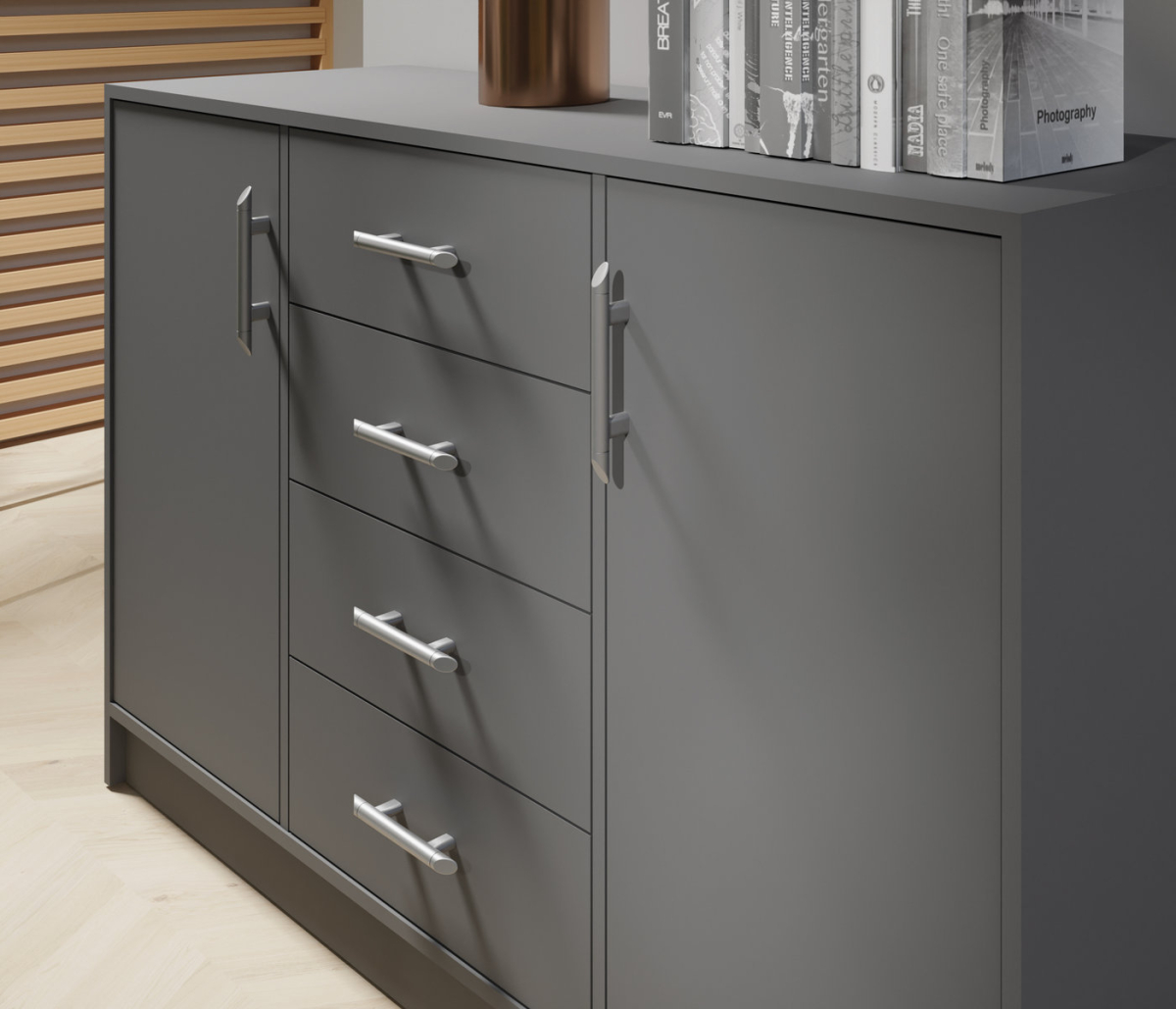 Praktický, variabilný sektorový nábytok do vašej spálne SMART - 4. dverová skriňa SR1, naviac vyrobená vo výbornej kvalite prevedenia a použitých materiálov. S nábytkom SMART ľahko a prakticky vyskladáte priestor vo vašej spálni, naviac skrine majú vďaka vlastnej konštrukcii a nadstavcom veľký úložný priestor. Materiál, z ktorého je nábytok vyrobený je certifikovaná laminovaná drevotrieska, ohranená ABS hranami na predĺženie životnosti. Úchytky sú plastové v čiernej a striebornej farbe.