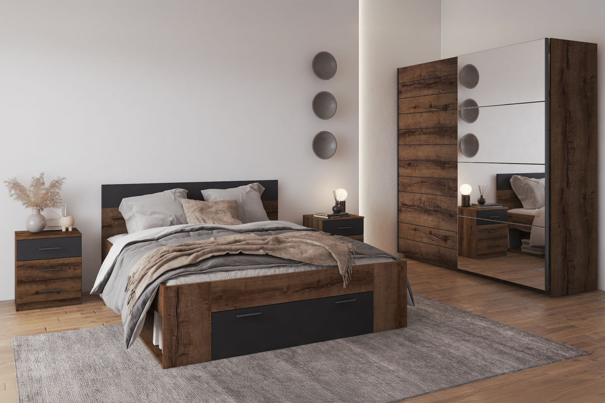 Spálňa BETA dub monasteri/zrkadlo-elegantná, moderná spáľňová zostava, vyrobená vo výbornej kvalite prevedenia. Farebné prevedenie dub monasteri/čierna 24ZB16.., materiál z ktorého je spálňa vyrobená korpusy a dvere - certifikovaná laminovaná DTD, kvalitné 3D lamino odolné voči poškriabaniu a UV žiareniu, na skrini v kombinácii so zrkadlom. Skriňa má kovové rámy dverí a kvalitné vedenia, čím je zaručený ľahký a tichý posuv dverí. Posteľ má úložný priestor. Spálňu BETA dub monasteri si môžete zakúpiť aj po častiach ako sektor.
