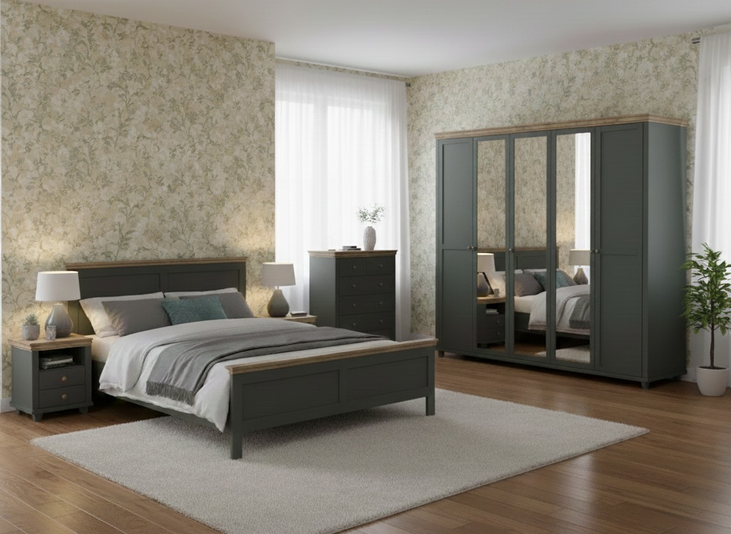 Zostava pôsobí esteticky – elegantná posteľ s vysokým čelom, praktické nočné stolíky a priestranná päťdverová skriňa so zrkadlami vytvárajú harmonický celok. Komoda ešte viac zvýrazňuje príjemnú atmosféru tohto štýlového nábytku.