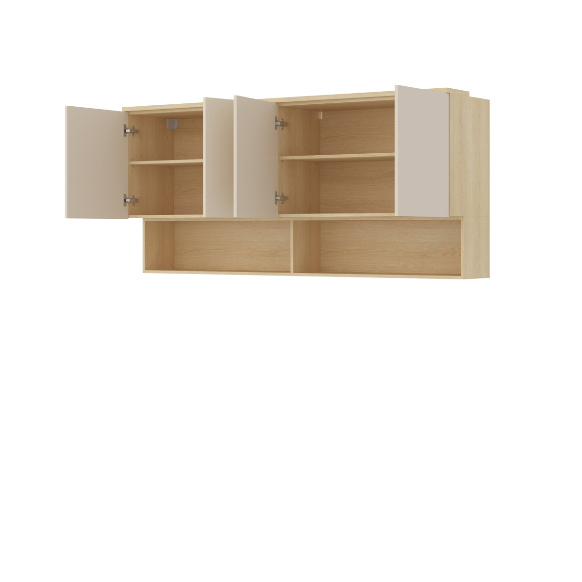 Inteligentné nadstavce - revolučné riešenie pre malé izby. Nadstavec nad posteľou prepojí bočné skrine a vytvorí súvislý úložný celok. Obsahuje otvorené police na knihy a uzavreté skrinky na veci, ktoré nechcete mať na očiach.