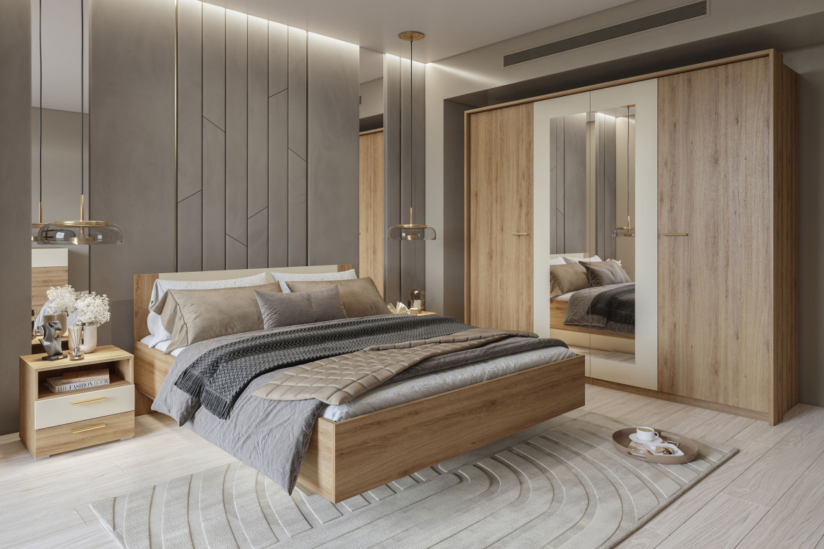 Moderná spálňová zostava VERTINA zostava 1, vo výbornej kvalite prevedení a vo farebnom prevedení divoký dub - béžová - 24DBNH.. Spálňa VERTINA spĺňa aj tie najnáročnejšie požiadavky zákazníkov. Vyrobená je z certifikovanej laminovanej DTD vysokej kvality odolnej voči poškriabaniu, ÚV žiareniu a vlhkosti. Skriňa 4-dverová má klasicky otvárané dvere v kombinácii so zrkadlom - možnosť dokúpiť okrasné lišty okolo korpusu skrine. Posteľ je vyrobená z laminovanej DTD vysokej kvality, čelo postele je hladké. Posteľ sa vyrába v dvoch veľkostiach šxvxh 160,180x200 cm. Do postele je možné dokúpiť klasické drevenné rámové rošty, alebo kovový rámový rošt so zdvíhaním na plynových piestoch. Nočný stolík má dva výsuvné šuflíky. Komoda obsahuje štyri výsuvné šuflíky. Úchytky sú zlaté plastové. Všetky prvky spálňovej zostavy VERTINA môžete vidieť TU.