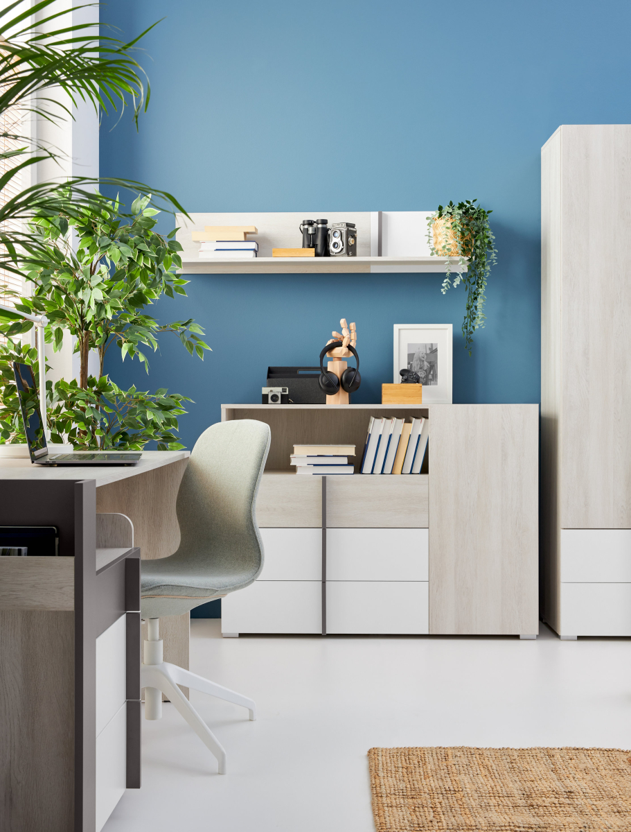 Farebná kombinácia je nápaditá, no zároveň neutrálna – výborne sa kombinuje s modernými tlmenými odtieňmi (béžová, sivá, taupe), pastelovými farbami (mentolová, púdrovo ružová, svetlomodrá) aj výraznejšími akcentmi (horčicová, tmavomodrá, smaragdová). Vďaka tomu nábytok ľahko prispôsobíte meniacemu sa vkusu dieťaťa či študenta – stačí zmeniť doplnky, textílie alebo dekorácie.