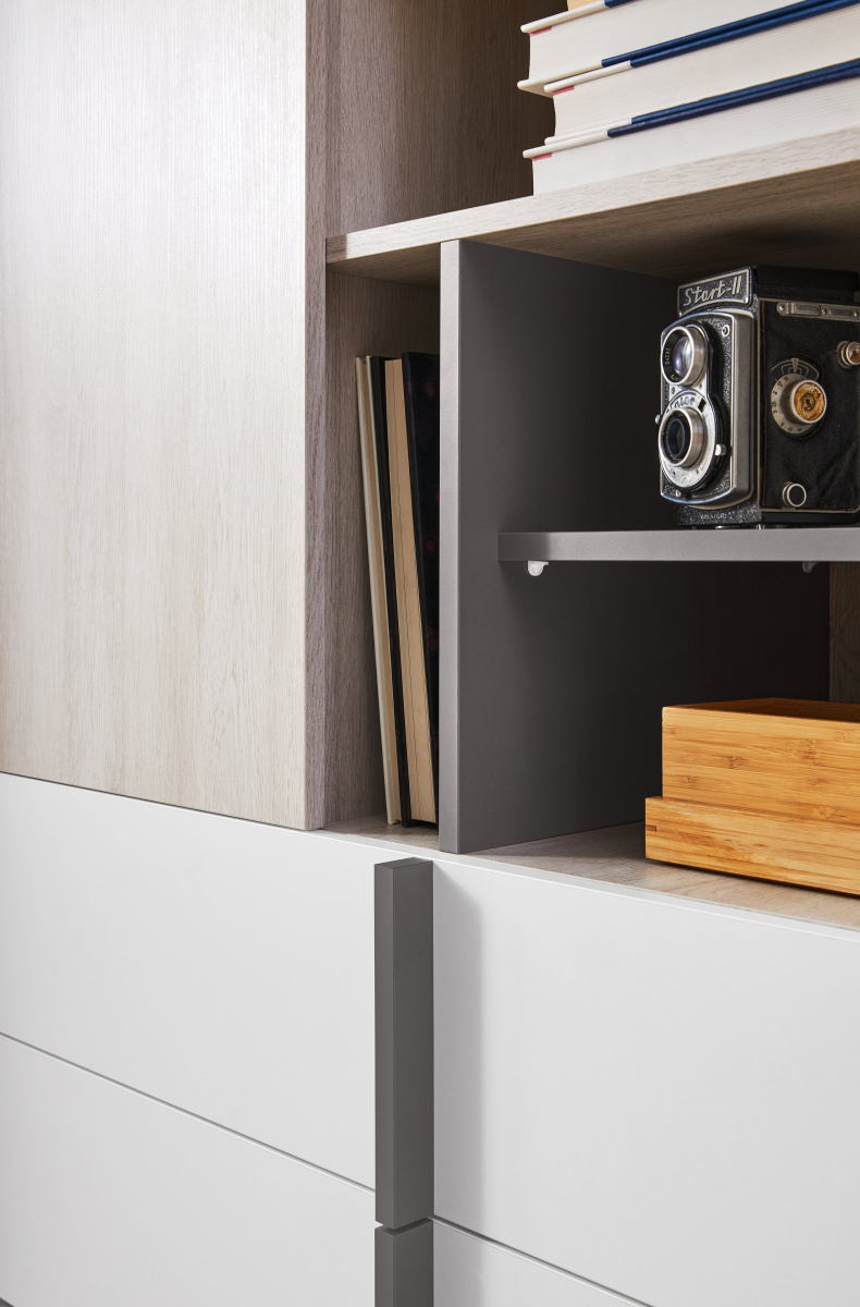 Systém zahŕňa skrine s kombinovaným úložným priestorom na vešanie aj ukladanie do políc, praktické zásuvky, regále, písacie stolíky, nástenné poličky a posteľ v šírke 90 alebo 120 cm. Jednotlivé moduly možno ľubovoľne kombinovať a vytvoriť tak zostavu presne podľa dispozície miestnosti a individuálnych potrieb.