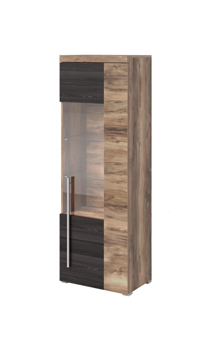 Sektorový nábytok ROGER vitrína 226ZZH06 - moderný obývací sektor v trendovom dizajne a výbornej kvalite prevedenia. Materiál, z ktorého je nábytok vyrobený korpus - certifikovaná laminovaná drevotrieska vo farebnom prevedení satin nussbaum, dvere - certifikovaná laminovaná drevotrieska vo farebnom prevedení satin nussbaum - touchwood / 226ZZH.. /. Úchytky sú plastové v striebornom prevedení, hrany sú olepené ABS páskou, sklo je priesvitné a zakalené.